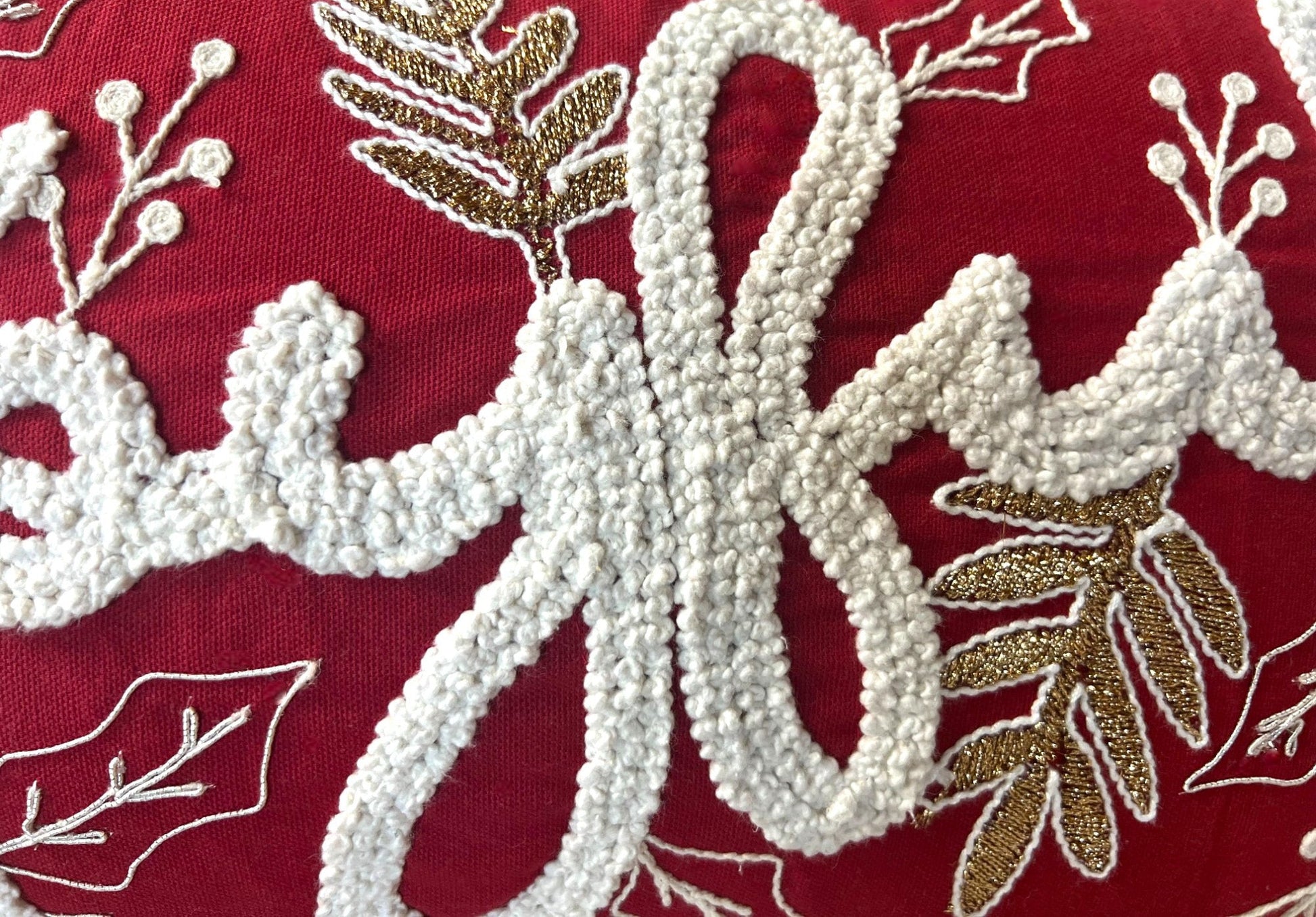 Featuring intricate gold thread embroidery of classic holiday motifs—trees, snowflakes, and reindeer—this piece adds warmth, charm, and tradition to any space.