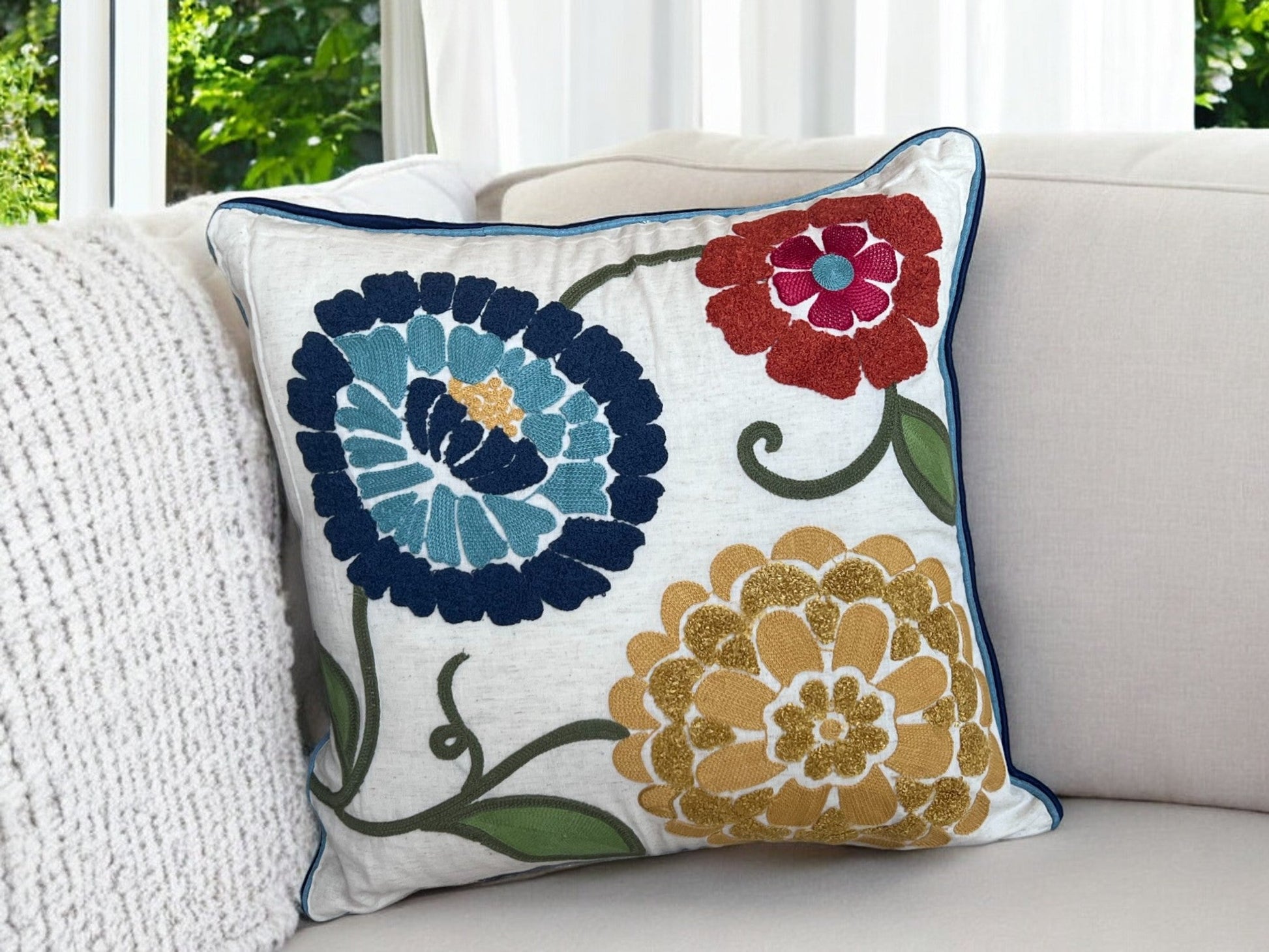 Brighten your space with this 18" x 18" square accent pillow, featuring vibrant embroidered floral designs that evoke a lively summer vibe. Crafted with care, its colorful patterns bring a cheerful touch to any room. Perfect for adding a splash of color and style to your sofa, bed, or favorite chair.